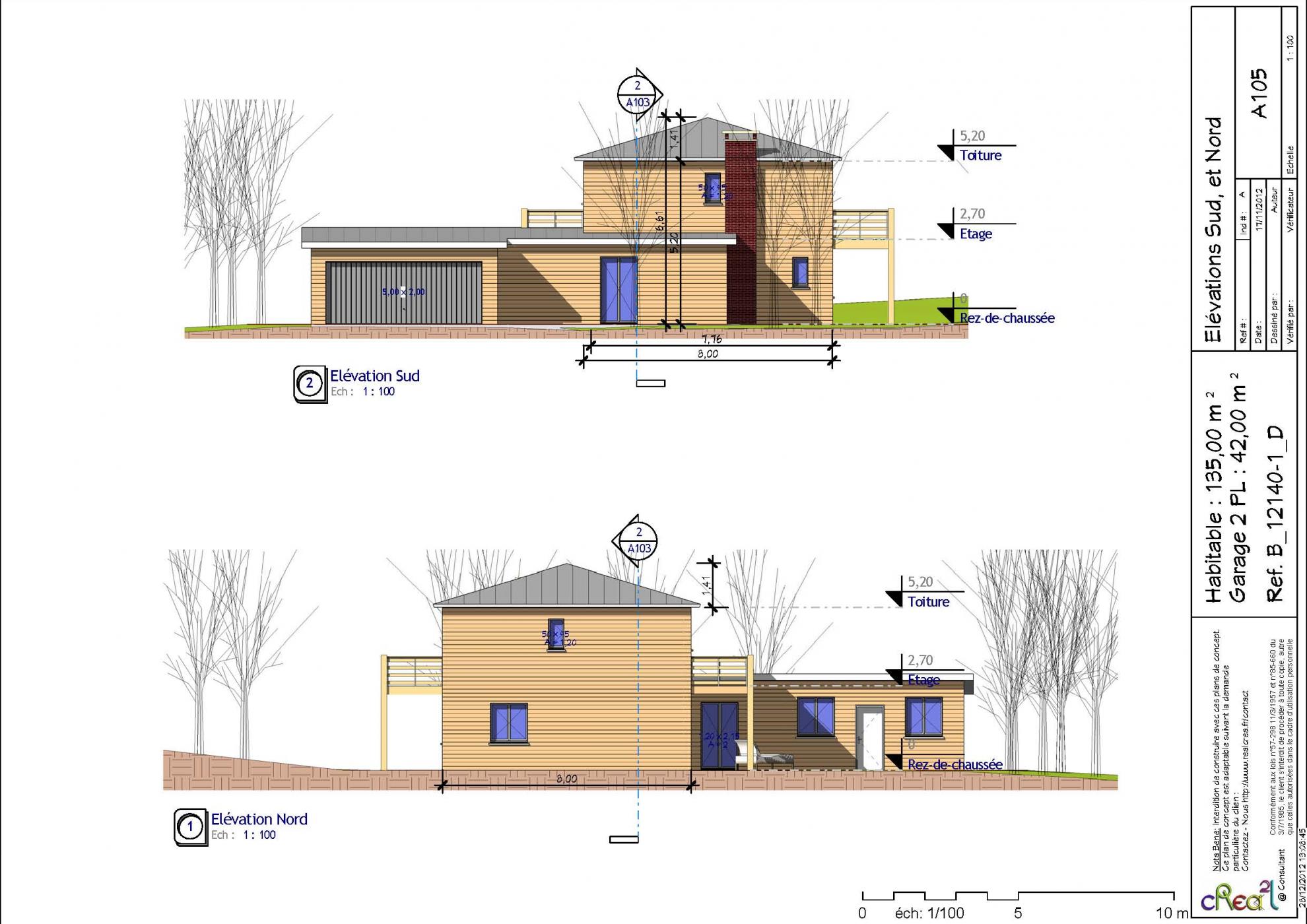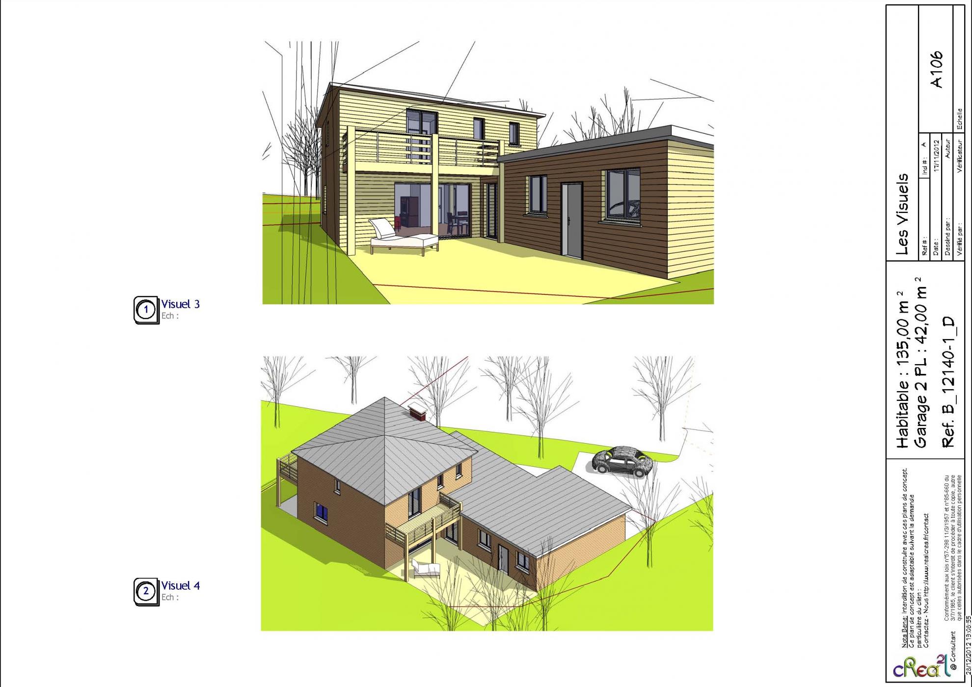 Plan B_12140-1_D : Maison moderne en bois 135 M² habitables, 2 chambres, 1 suite, grand garage à 2 places.