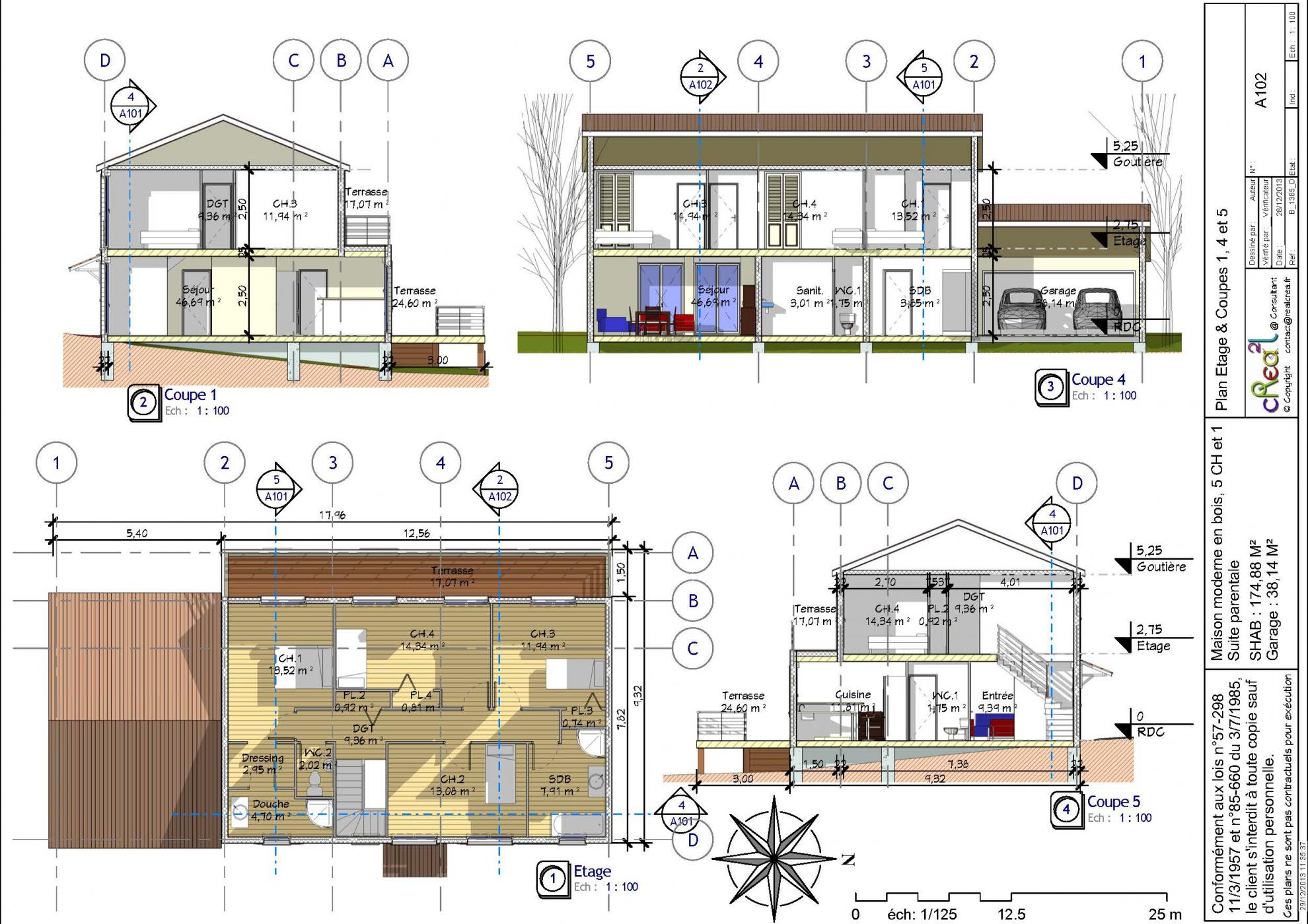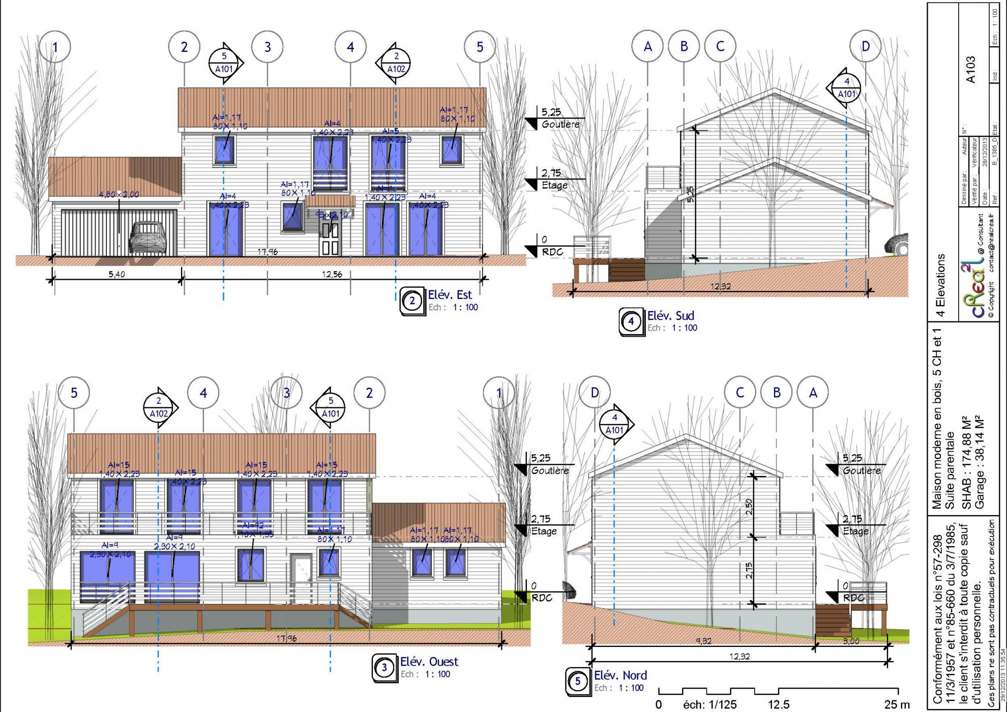 Plan B_13185_D : Maison moderne en bois 175 M² habitables, R+1, 4 Chambres, 1 Suite, Grand double garage intégré.
