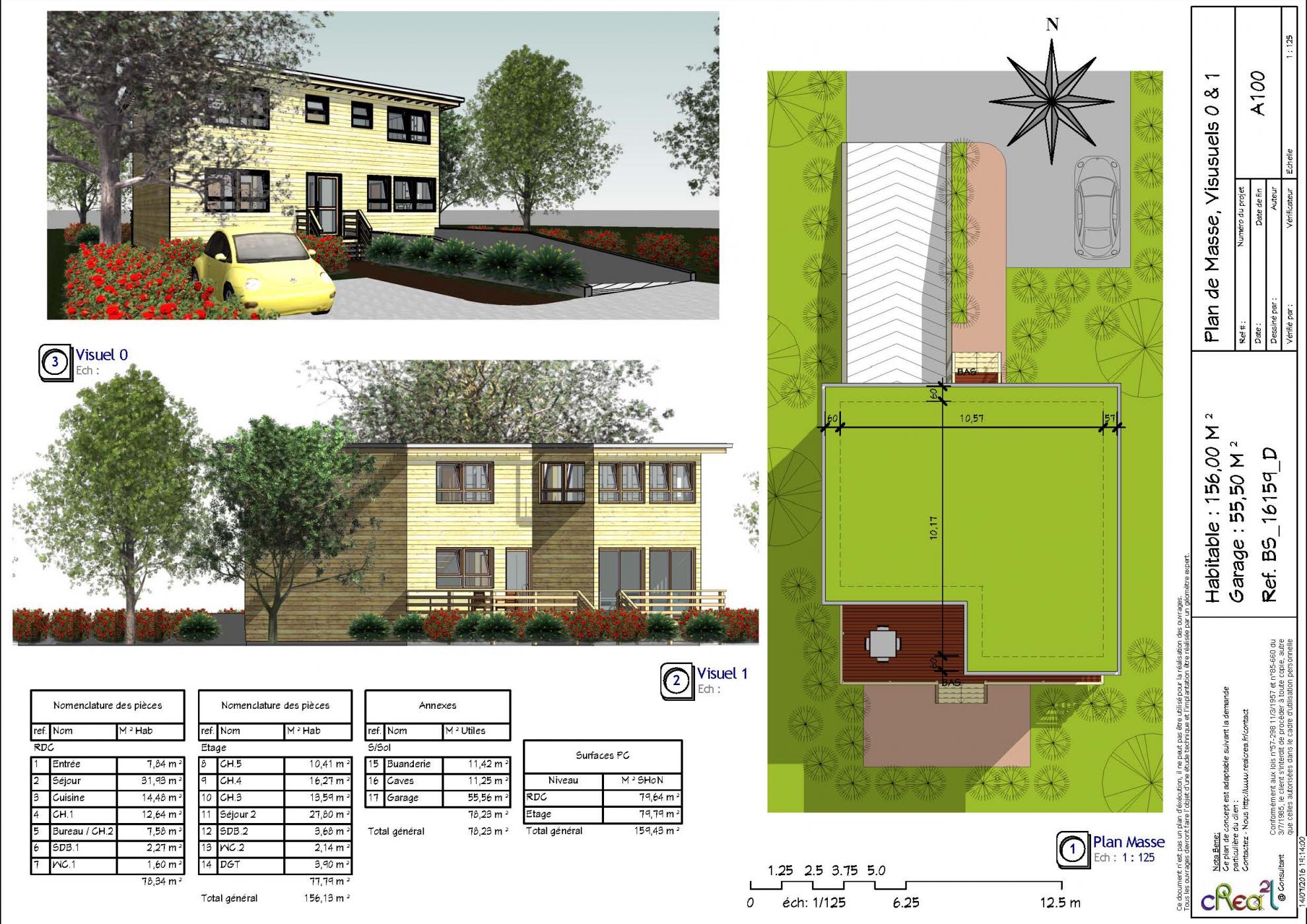 Plan BS_16159_D : Maison Bois contemporaine, T5, 156 m², 4 Chambres et 1 Suite, 2 séjours, Terrasse privative, sous sol complet, grand Garage.