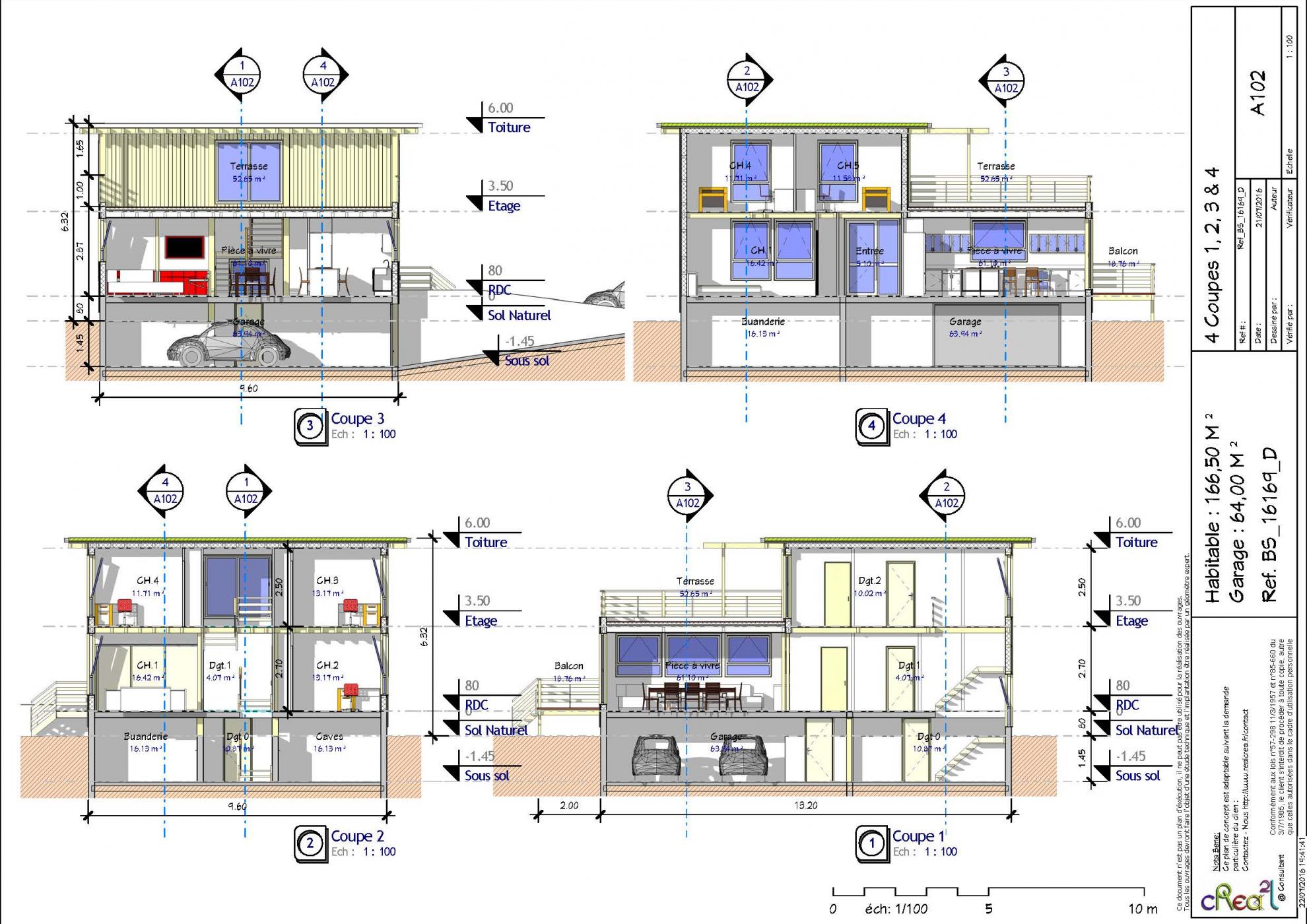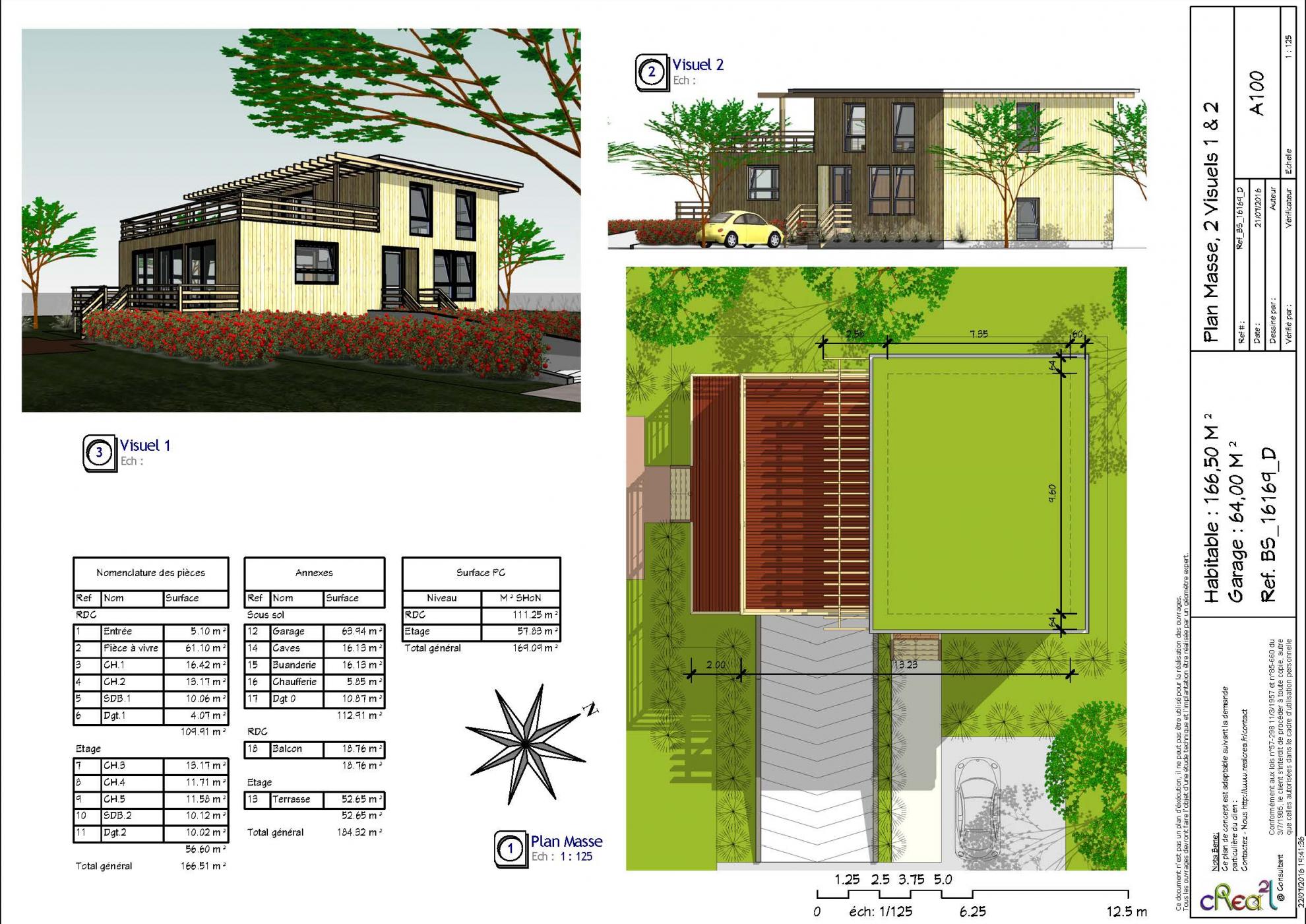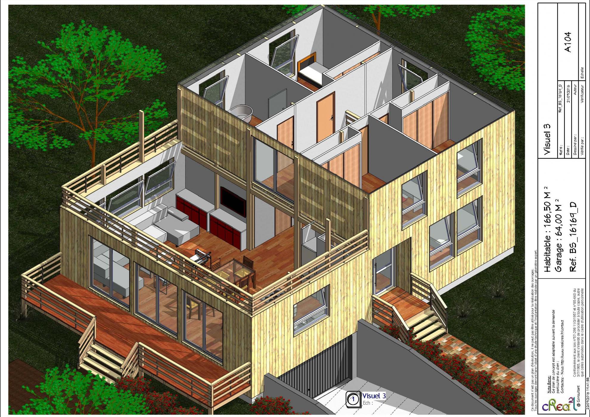 Plan BS_16169_D : Maison Bois contemporaine, T5, 166 m², 5 Chambres, Grand séjour, Cuisine ilot central, sous sol complet, grand Garage.