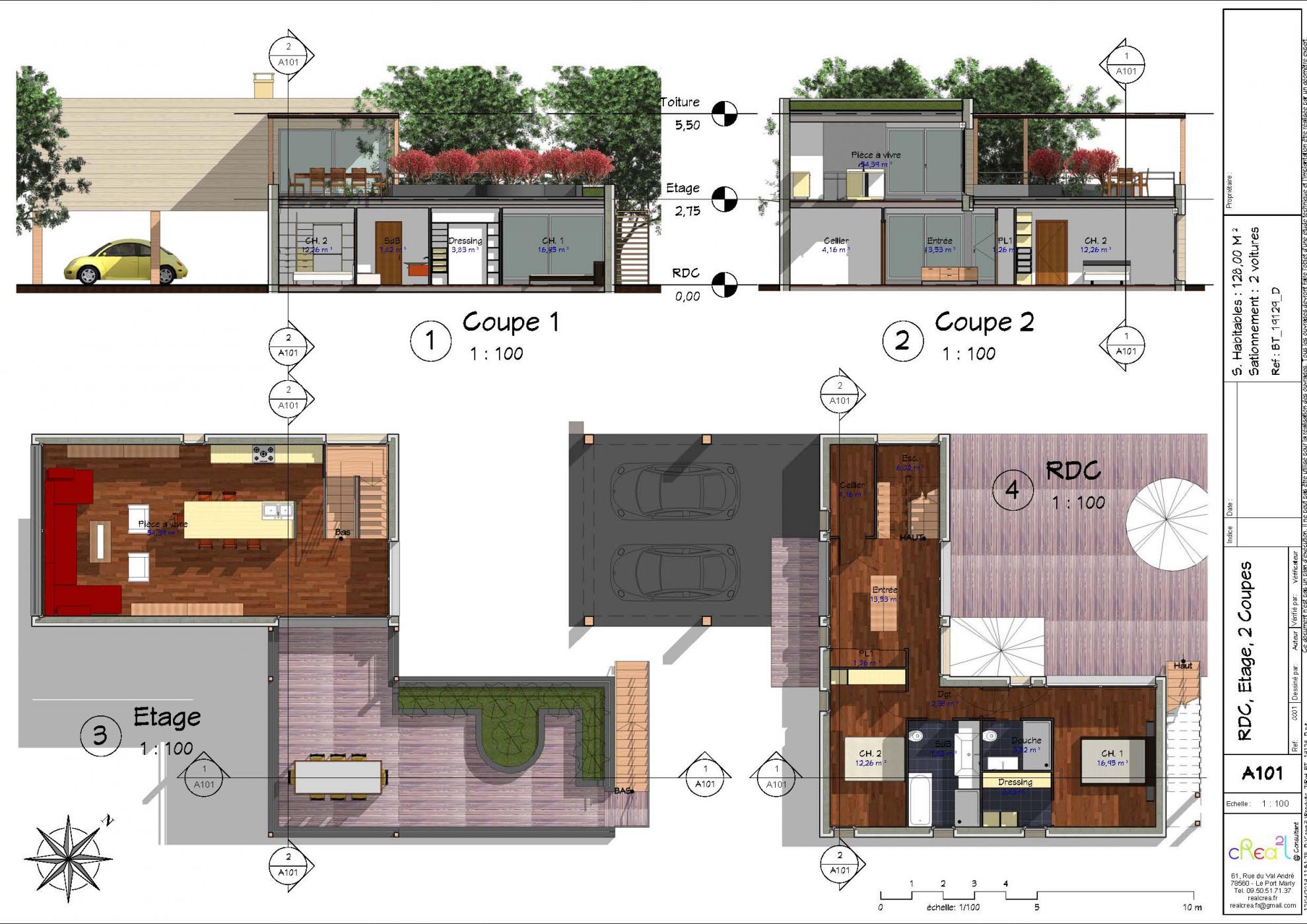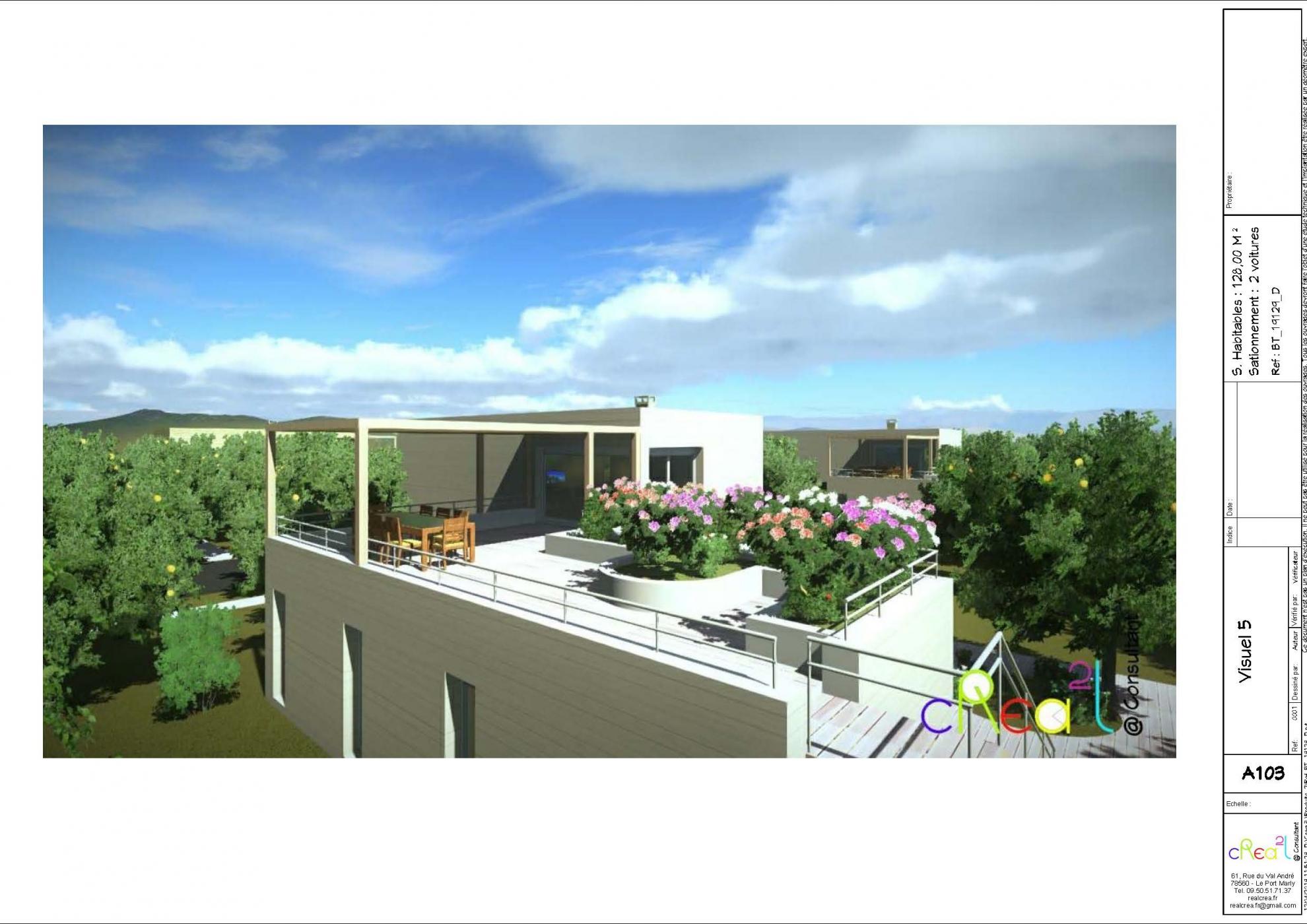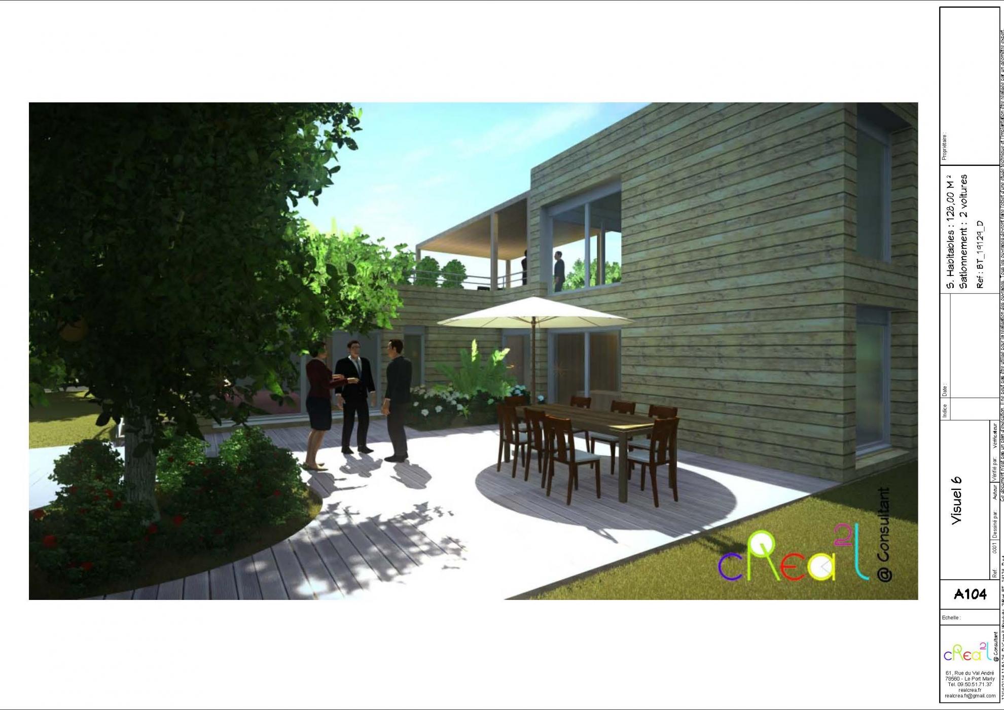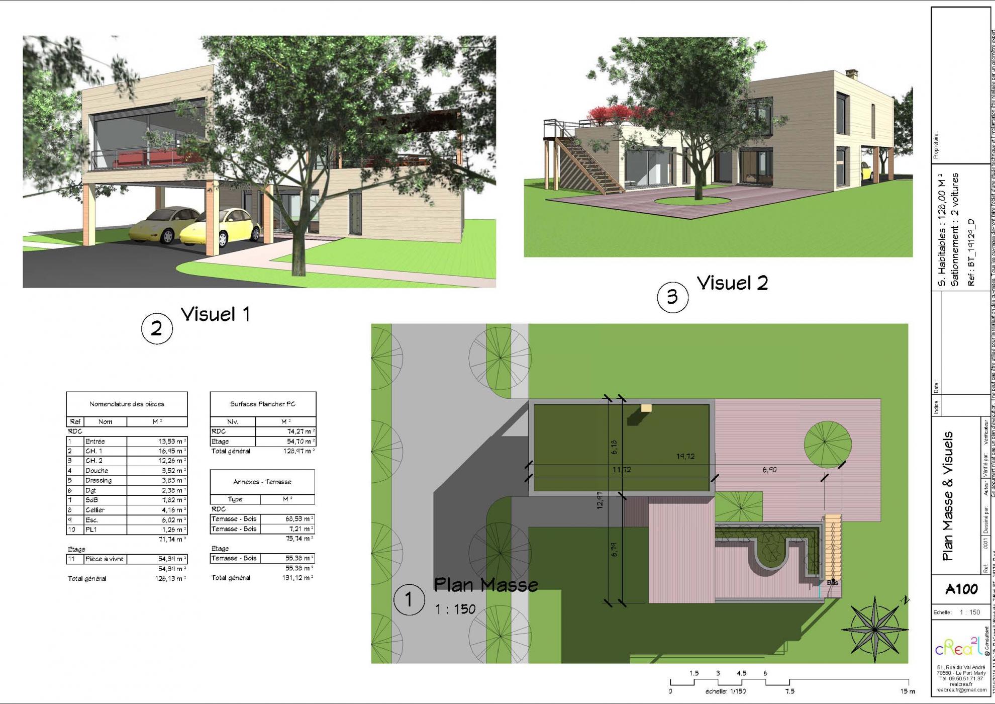 Plan BT_19129_D : Maison en bois à grande terrasse, grande séjour à étage, 2 chambres, 127 m² habitables, car-port à 2 voitures intégré.