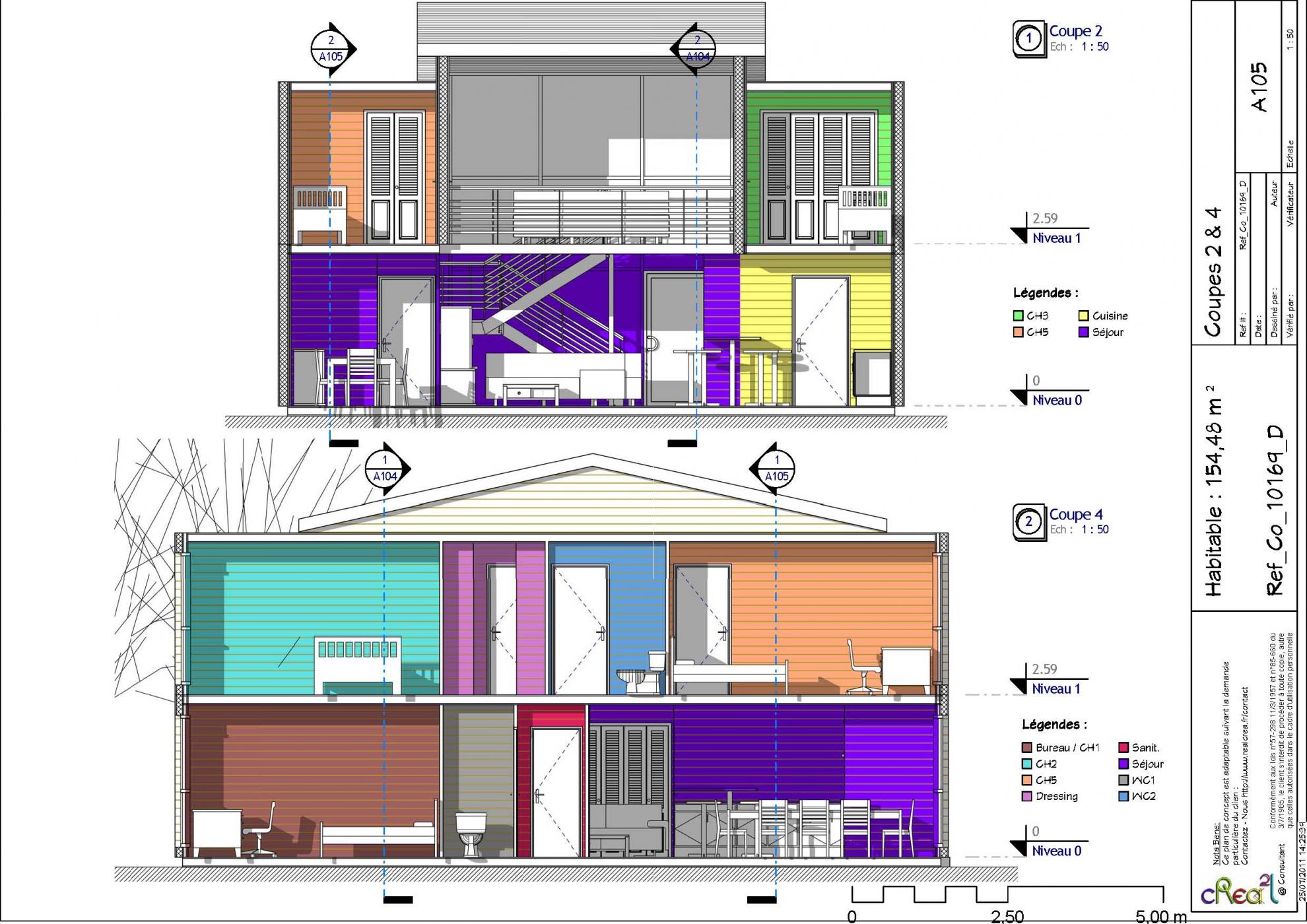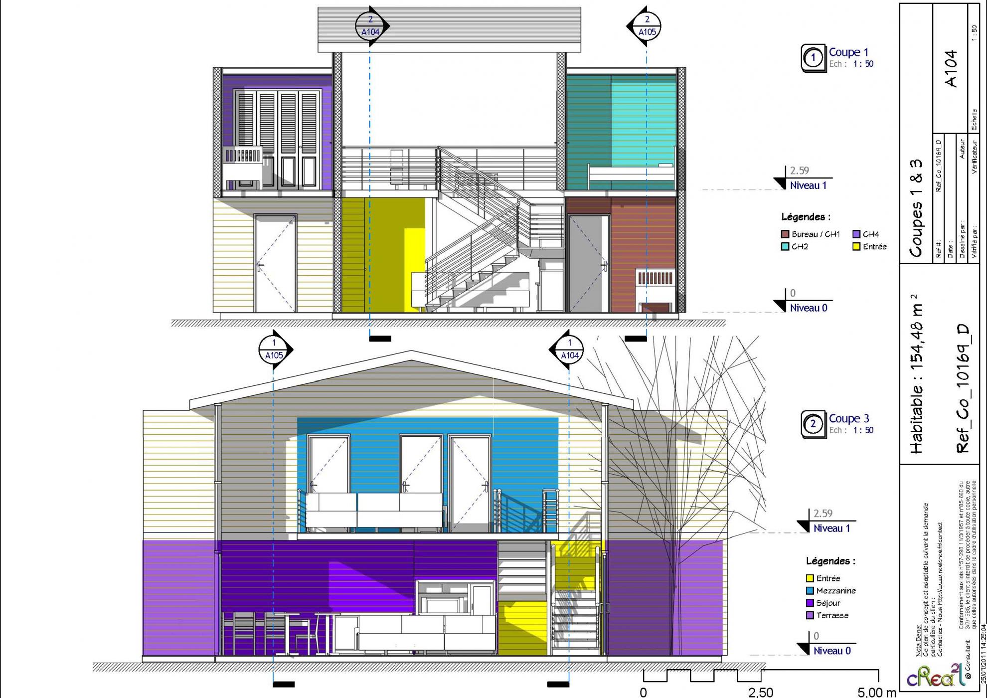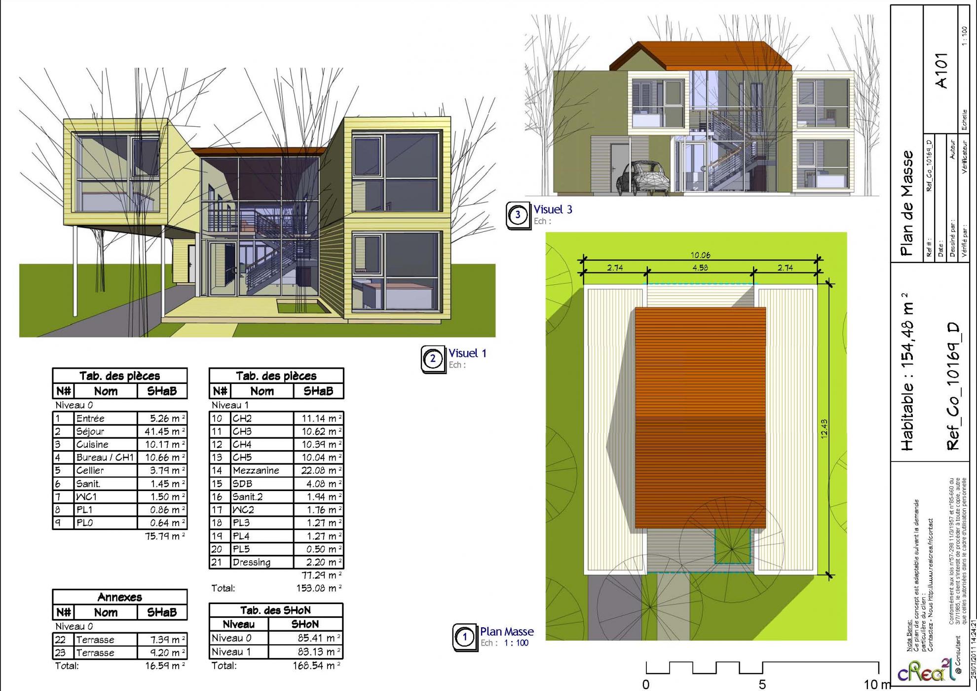 Plan Co_14183_D : Maison contemporaine R+1, 173 M², avec 15 Containers maritimes de 6 M, F5...