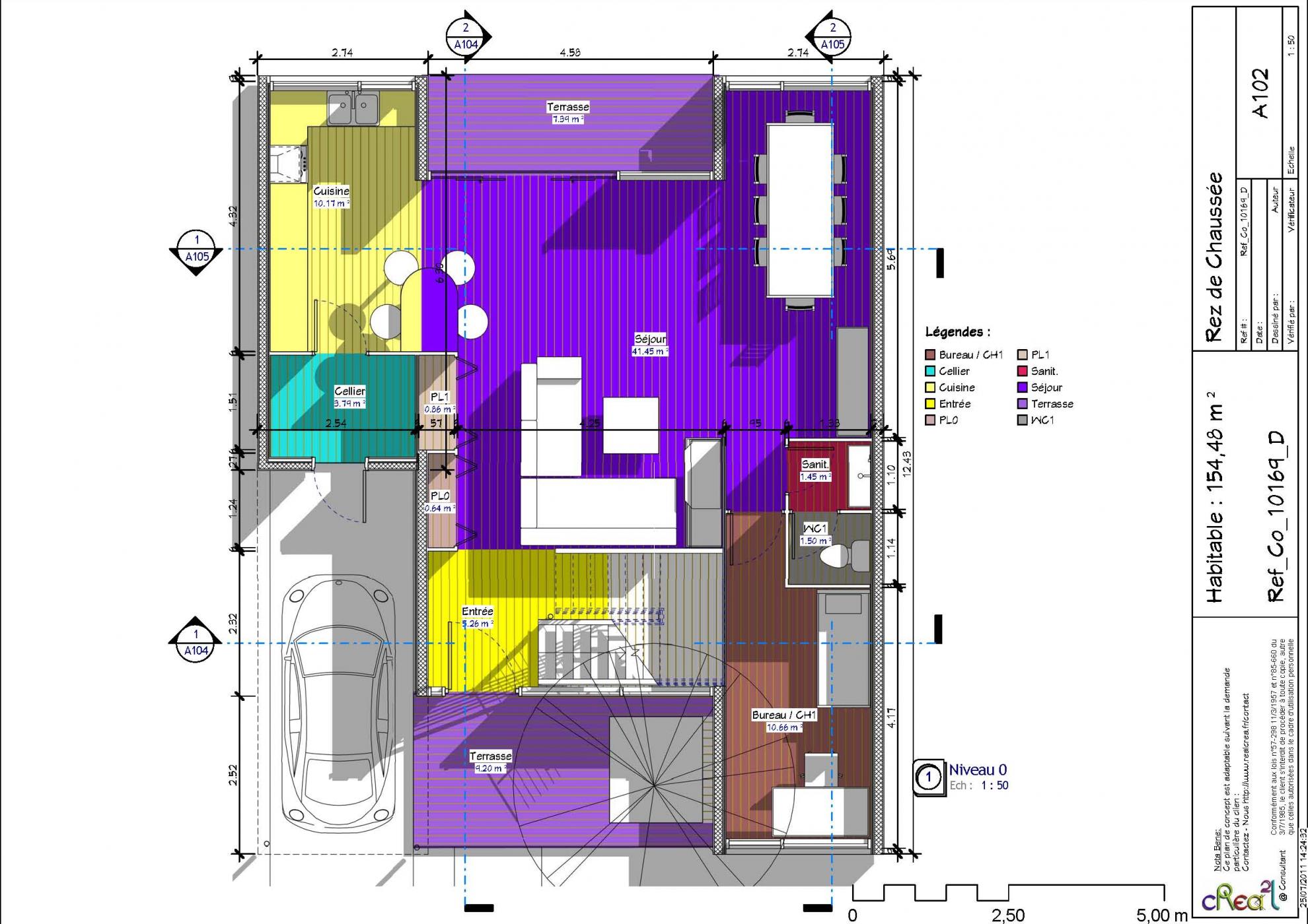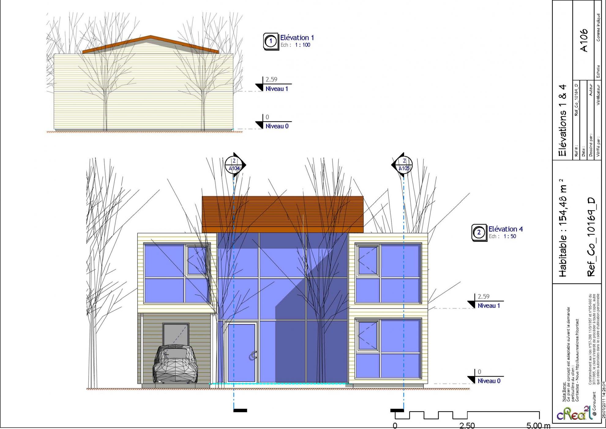 Plan Co_10169_D : Maison container R+1 ayant 154 m² habitable, 5 chambres et l'abri automobile intégré.