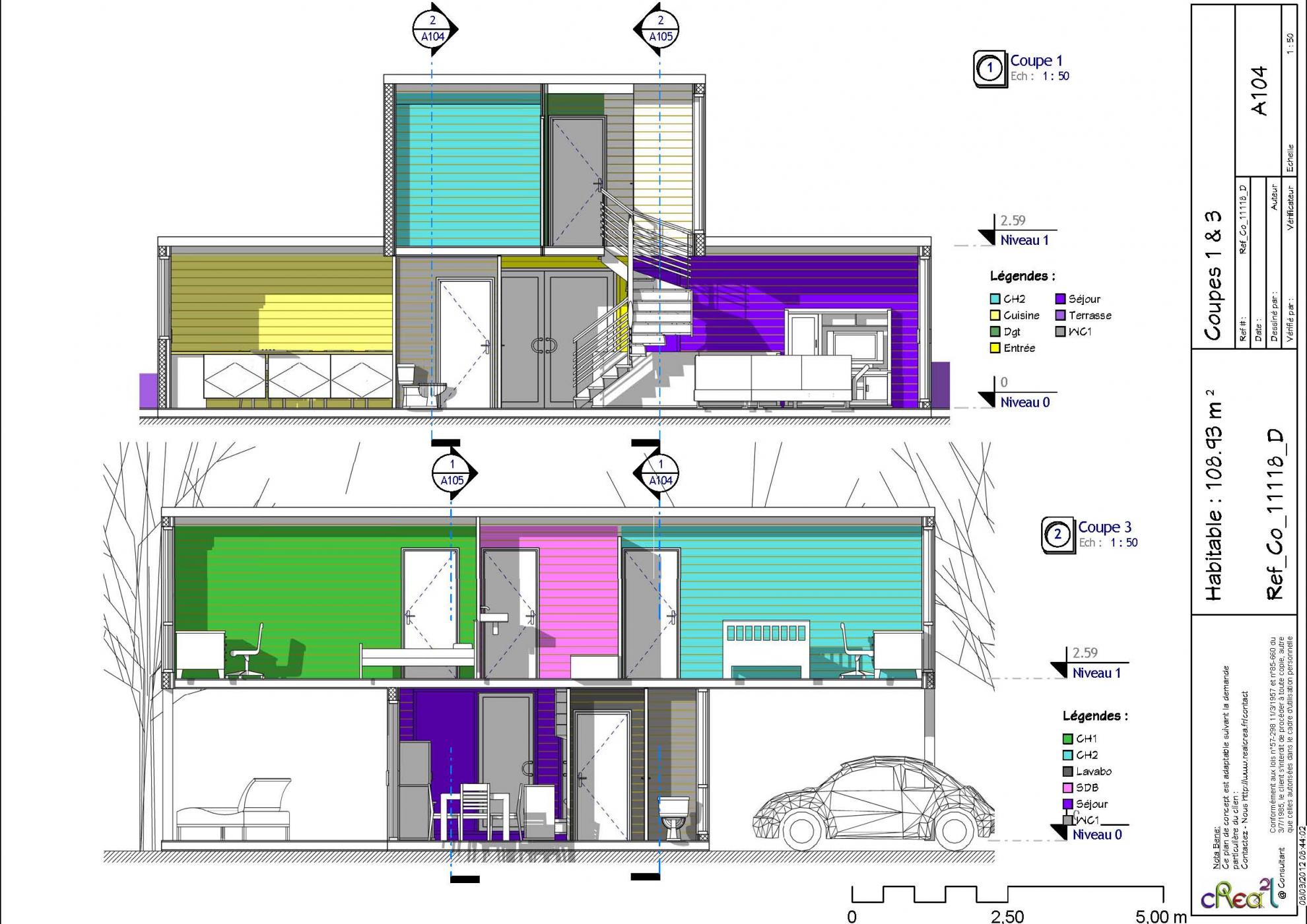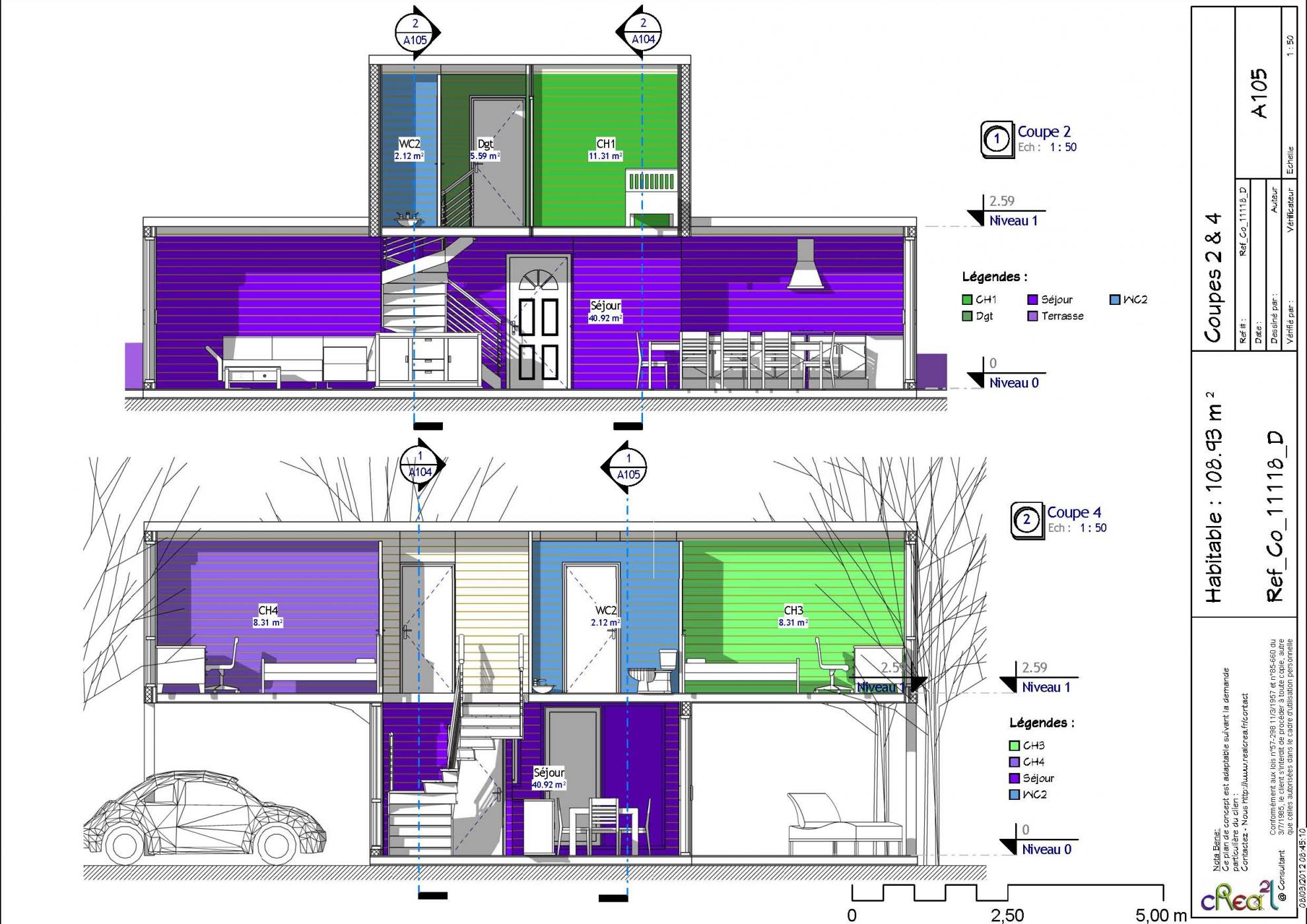 Plan Co_14183_D : Maison contemporaine R+1, 173 M², avec 15 Containers maritimes de 6 M, F5...